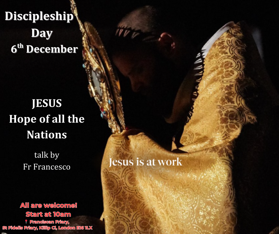 |JESUS, Hope of all the Nations,| A day of prayer and fellowship, Reflection and Community. Discipleship Days include the rosary, Mass, lunch, talks, adoration, vespers and confessions.