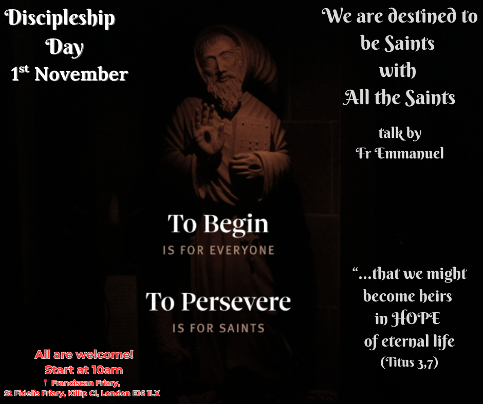 |We are destined to be Saints with All the Saints,| A day of prayer and fellowship, Reflection and Community. Discipleship Days include the rosary, Mass, lunch, talks, adoration, vespers and confessions.